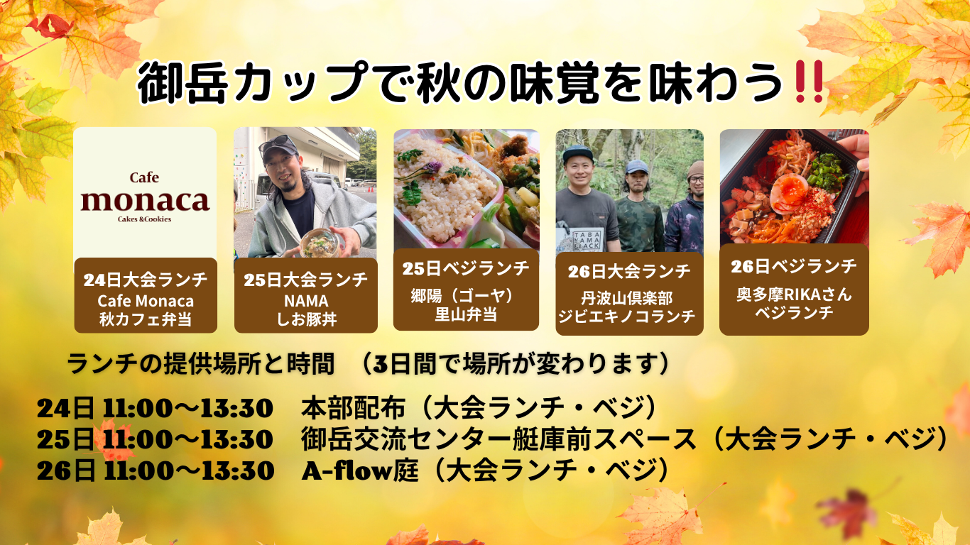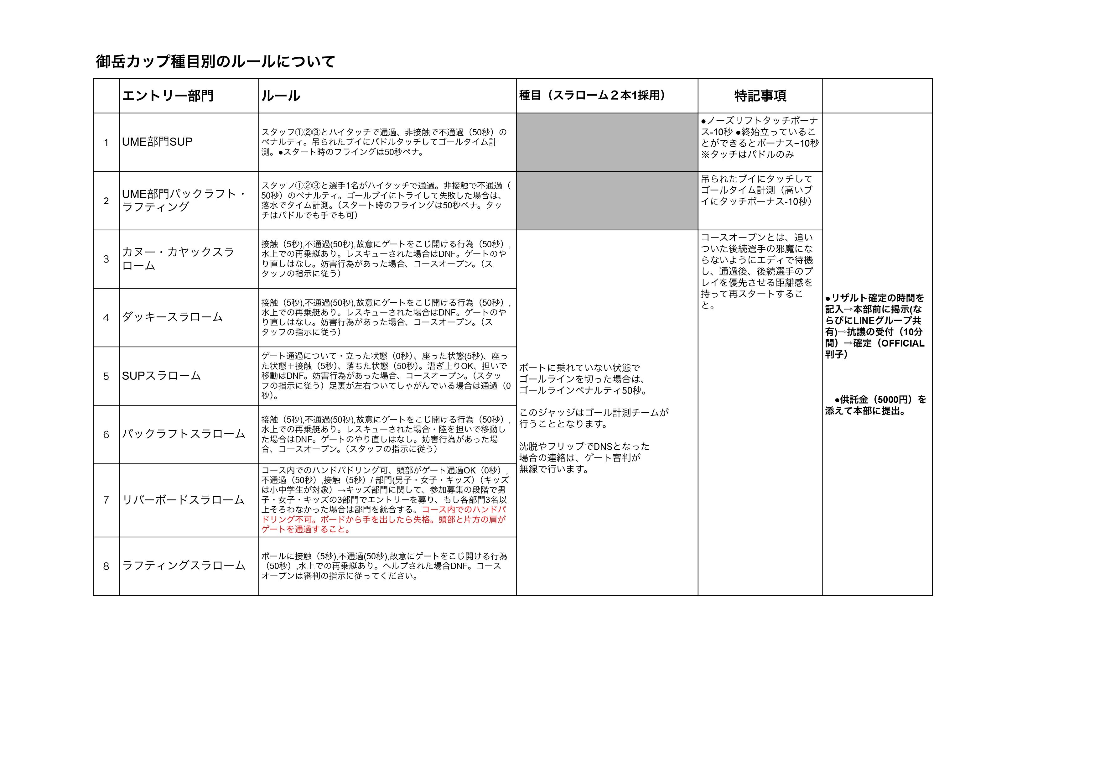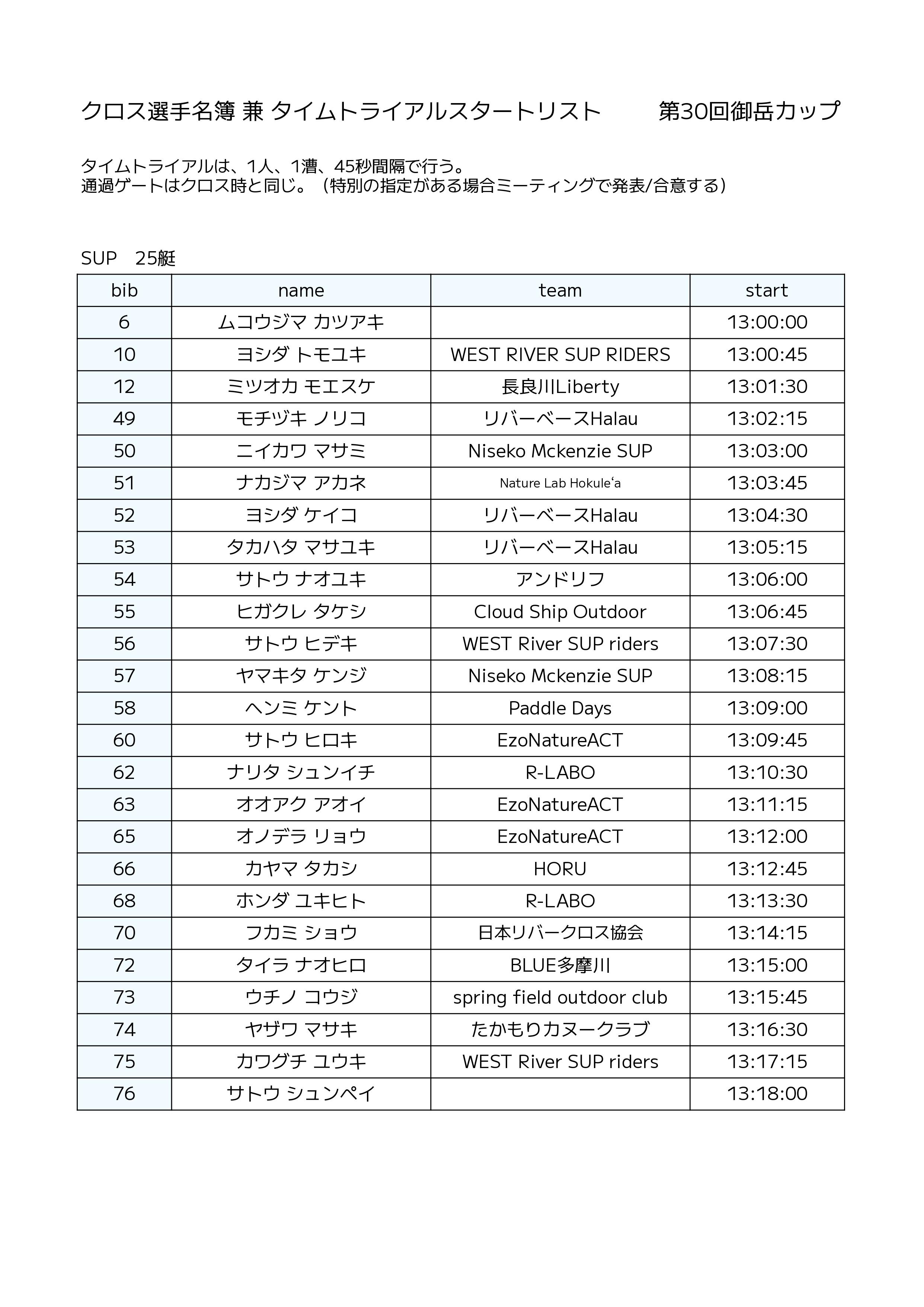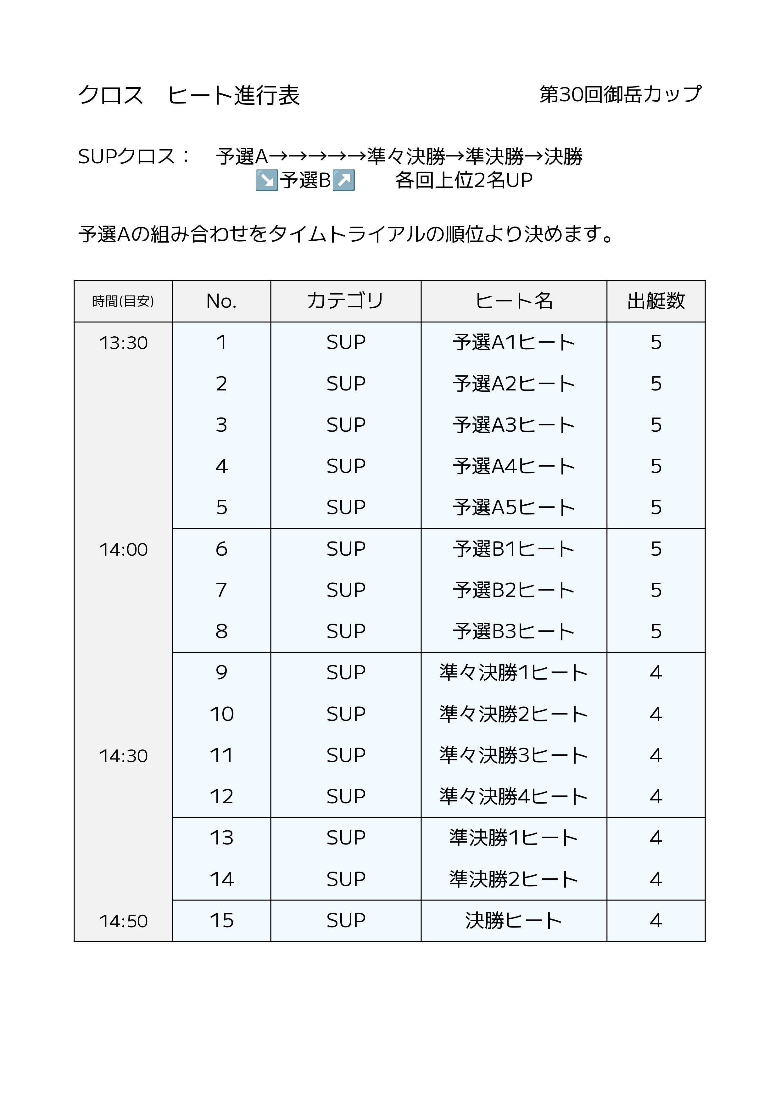10/26(日) | 7:00-7:50 受付(SUP一般・UME部門) 8:00 開会式・選手ミーティング 8:30 フォアラン 9:15-10:00 SUP一般部門1本目 10:15-10:45 UME部門 11:00-11:30 受付(SUPエキスパート) 11:30 選手ミーティング(SUPエキスパート) 11:10-12:00 SUP一般部門2本目 12:30 午前の部表彰式 13:15-13:50 SUPエキスパート部門1本目 14:15-14:50 SUPエキスパート部門2本目 15:00 競技終了後、ゲート撤収(ご協力をお願いします) 16:30 午後の部表彰式 |