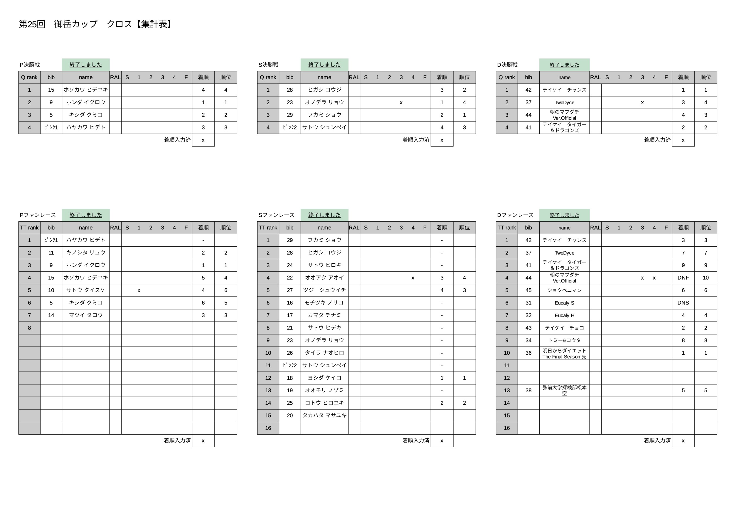 AMコースセット・フリー練習 11:30-12:00クロス出場選手受付 12:00 開会式・選手ミーティング 13:00 タイムトライアル(出場選手SUP25名) 13:30-15:00クロスレース 15:15 表彰式 ※16:00 コースクローズ(25日出場選手) |