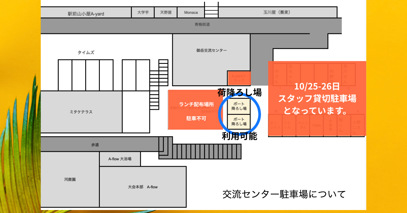| 10/26(日) | 7:00-7:50 受付(SUP一般・UME部門) 8:00 開会式・選手ミーティング 8:30 フォアラン 9:15-10:00 SUP一般部門1本目 10:15-10:45 UME部門 11:00-11:30 受付(SUPエキスパート) 11:30 選手ミーティング(SUPエキスパート) 11:10-12:00 SUP一般部門2本目 12:30 午前の部表彰式 13:15-13:50 SUPエキスパート部門1本目 14:15-14:50 SUPエキスパート部門2本目 15:00 競技終了後、ゲート撤収(ご協力をお願いします) 16:30 午後の部表彰式 |